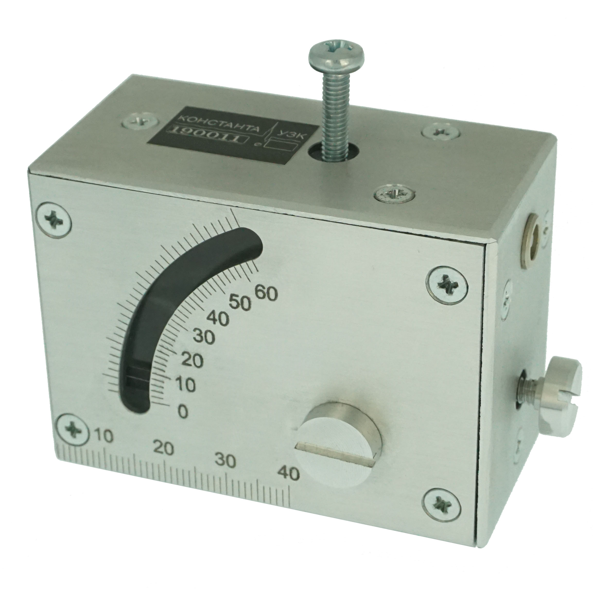 Преобразователь предназначен для возбуждения продольных и поперечных волн под необходимым углом, а также для возбуждения импульсов волн Лэмба и Релея при контроле в заводских условиях и при лабораторных исследованиях. Изготовлен по схеме с переменной точкой выхода ультразвуковых колебаний (с подвижным цилиндрическим элементом). Изготовлен в алюминиевом корпусе. На корпус нанесена шкала для отсчета текущего угла падения луча. обозначение преобразователя – П131-ХХ-0-90? (где ХХ – требуемая частота).