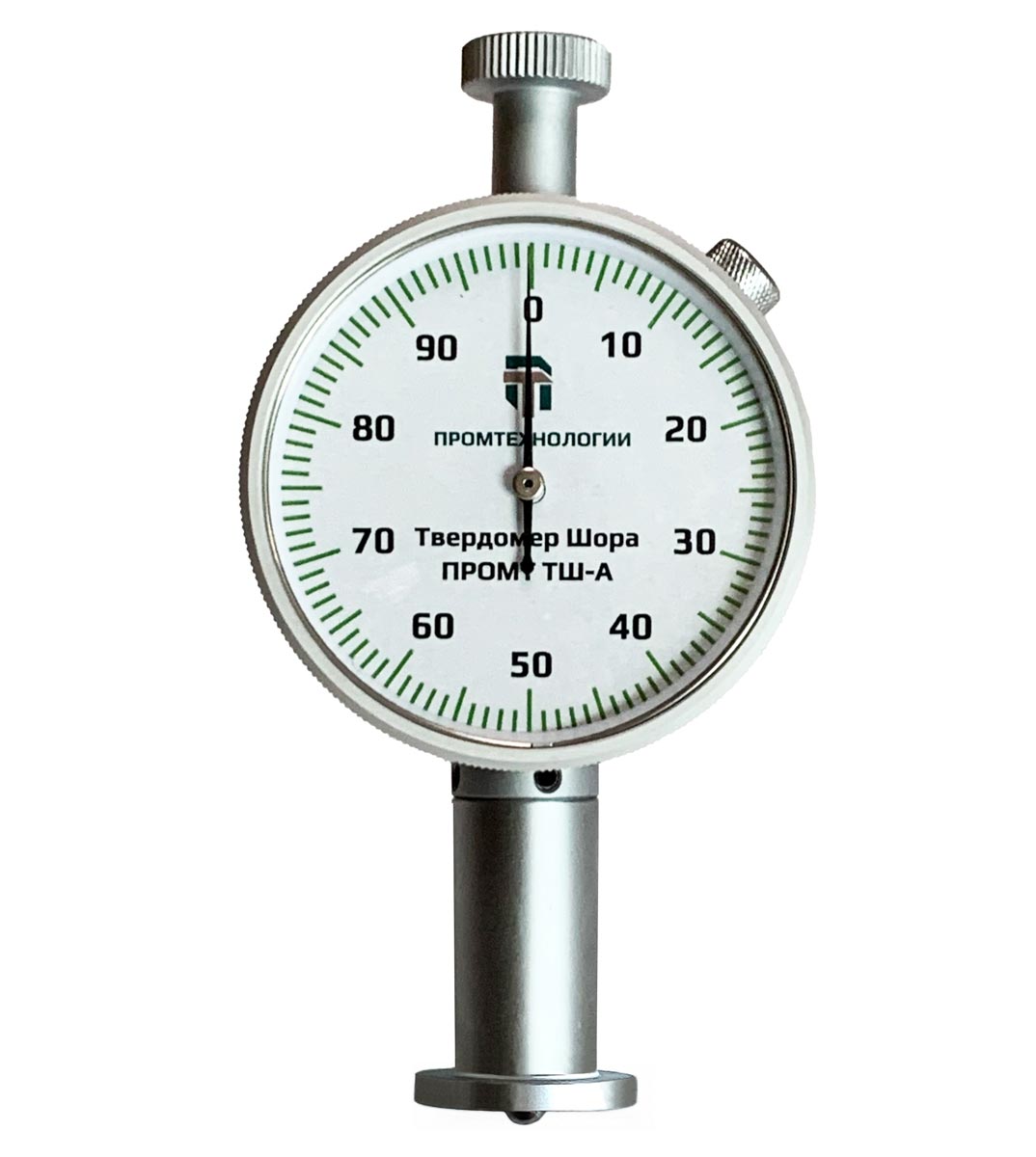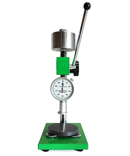 Это простой и надежный механический прибор с металлическим корпусом, индикатором часового типа, поворотным циферблатом для корректной установки нуля и удлиненной контактной площадкой облегчающей применение дюрометра. Внутри устройства установлена тарированная пружина обеспечивающая требуемое усилие на индентор специальной формы из закаленной стали и механизм фиксации его перемещения. Для проведения измерения в соответствии с ГОСТ также потребуется секундомер и термометр. Твердомер Шора ПРОМТ ТШ-А (тип АО/С) не требует специальных навыков для работы с ним и позволяет оперативно контролировать твердость мягких резины и пластиков, силикона, винила и аналогичных материалов в лабораторных и цеховых условиях.