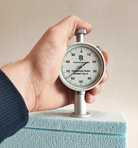 Твердомер по Шору (дюрометр) ПРОМТ ТШ-А (тип АО) используется для контроля твердости при вдавливании объектов с низкой твердостью (мягкой резины, пенополистирола, иных мягких, микропористых и аналогичных материалов) по методу Шора в соответствии с ГОСТ Р ИСО 7619-1-2009 и ISO 7619-1. В зарубежных странах аналогичный прибор также может иметь обозначение «тип С» (встречается еще ASKER-C или ASK-C) в соответствии с японскими стандартами JIS K 7312 и JIS S 6050, тогда как указанные выше российский ГОСТ и международный ISO под типом С предусматривают дюрометр с иными характеристиками. В основу метода положено определение глубины вдавливания индентора определенной формы под воздействием заданной силы в течение необходимого времени. За результат измерения принимается значение твердости в единицах Шора АО (HAО) в диапазоне от 0 до 100 отображаемое на индикаторе часового типа. Температура воздуха и материала является важным параметром при проведении испытания и определяется ГОСТ либо нормативными документами на объект испытания. Относительная влажность также может влиять на твердость некоторых материалов.